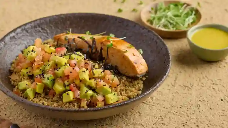 Pechuga de pollo cocida al vapor con finas hierbas, salteado de frijol rojo con ajo, albahaca y cebolla grille, pico de gallo, aguacate, , ajonjolí negro, maicitos y tomates cherry con vinagreta de amapola y ajonjolí .