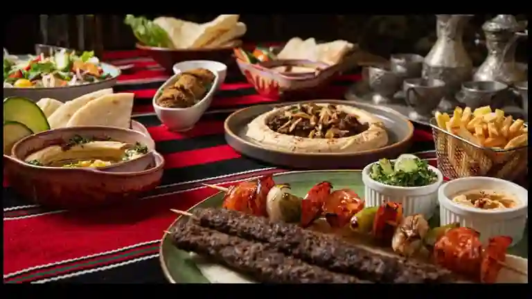 Shawarma, kibbe, empanada de queso y orégano, hummus, salsa de ajo, acompañado de papas a la francesa.