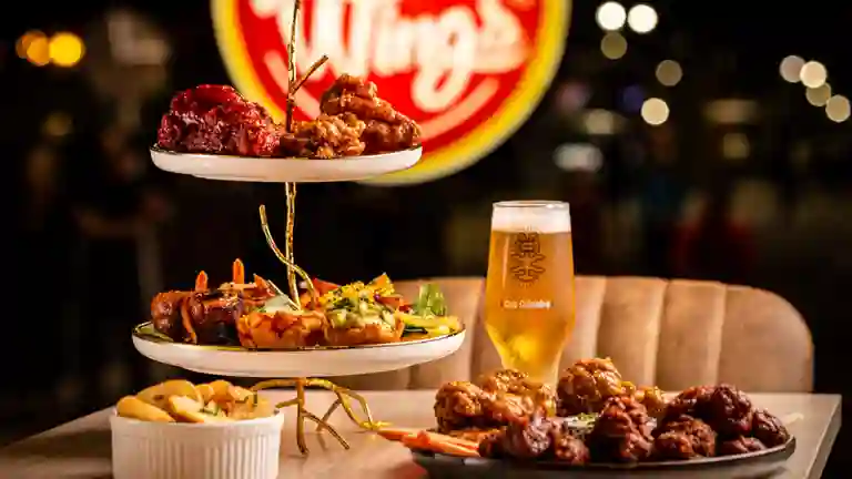 50 Alitas bañadas en 6 salsas, bastones de apio, zanahoria, dip de queso, 4 acompañantes a elección y 4 bebidas a elección.