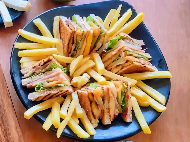 Dos sándwich club house, papas fritas, té frío 14oz a elegir