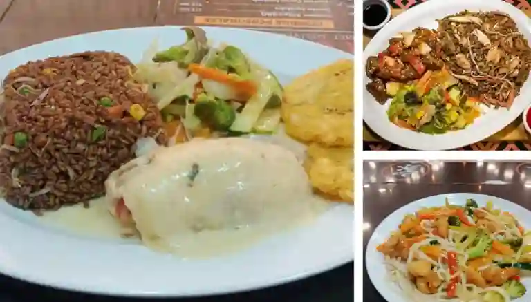 Arroz con salmón, patacones, chop suey y Bebida 250ml sabor a disponibilidad en tienda.
