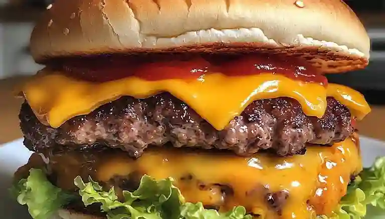 Hamburguesa con Doble carne de res premium con tocineta, jamón, queso cheddar, mozzarella y vegetales.