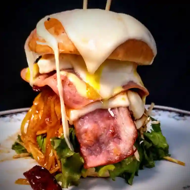 Hamburguesa con pan brioche, carne 140 gr, papa ripio, jamón, tocineta, cebolla caramelizada, queso mozzarella, queso costeño, gratinada, lechuga y tomate.