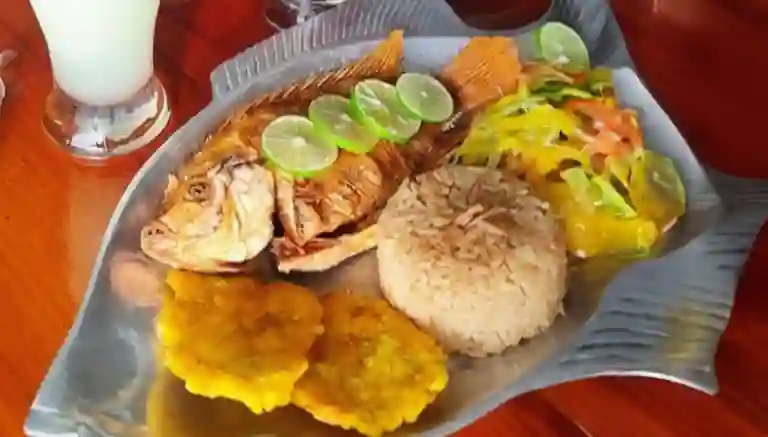Mojarra frita acompañada de arroz coco, patacones, ensalada y sopa pescado.