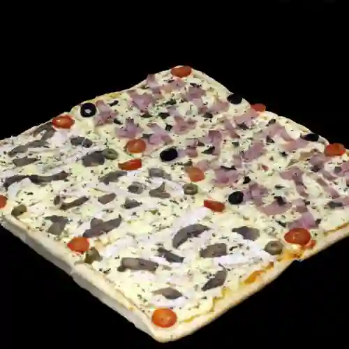 Porción de pizza especial con jamón, champiñones, cabano, tomate cherry, aceitunas verdes y tamaño a elegir.