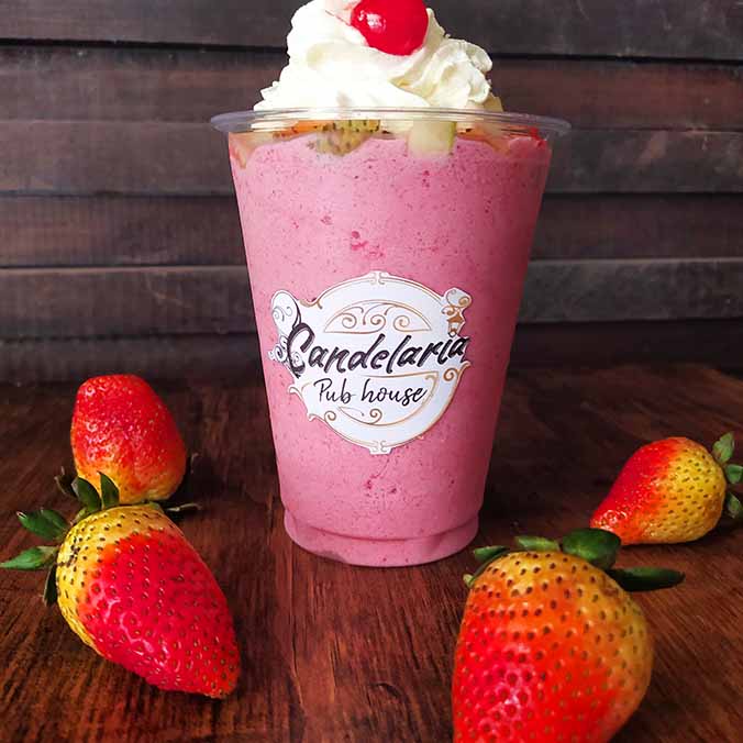Batido con leche entera, yogur de fresa, mora, fresa, manzana, chantilly y cereza 16 oz.