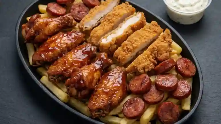 12 Crocantes y jugosas piezas de alitas bañadas en salsa bbq, acompañadas de papa francesa.