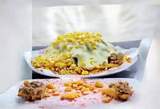 Salchicha suiza, pollo, chorizo, papa francesa, queso costeño, lechuga, cebolla sofrita, papita ripio