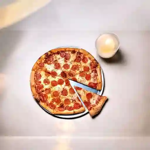 Piiza de salsa napolitana, queso mozzarella, peperoni, tocineta, maíz, cebolla, pimentón