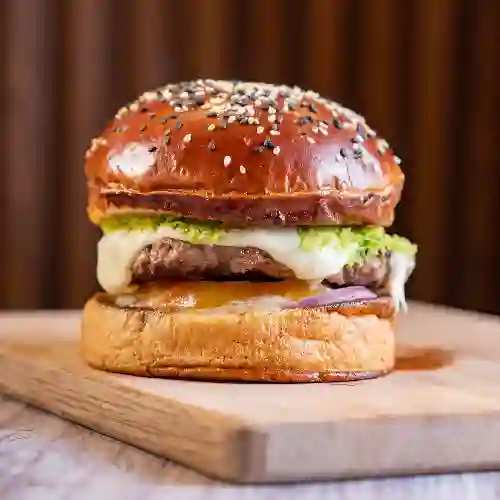 Carne de res de 150 gr receta de la casa, queso cheddar amaricano, guacamole, jalapeños, vegetales frescos (tomate, cebolla morada, lechuga) salsa de la casa y pan brioche.