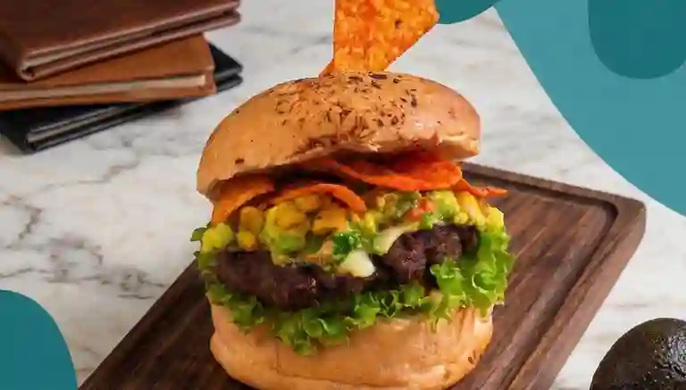 Hamburguesa con pan, lechuga, tomate, cebolla agridulce, carne 130gr, queso, doritos flaming, guacamole y jalapeños.