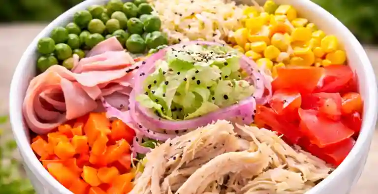 Ensalada con jamón, pollo, tomate, maicitos, cebolla queso rallado, arveja y zanahoria