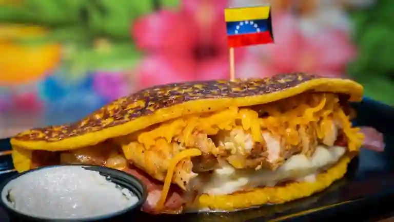 Arepa asada rellena con carne de res desmechada, caraotas (frijol negro), queso rallado y tajadas de plátano maduro.