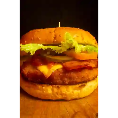 Hamburguesa con carne de res, tocineta queso mozzarella, cebolla, lechuga, tomate y salsas de la casa.