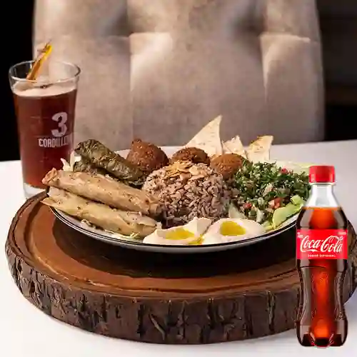 Arroz de almendras con tabule, 1 kibbeh, 3 hojas de uva, 3 rollitos de repollo y 2 falafel de la casa. + Gaseosa