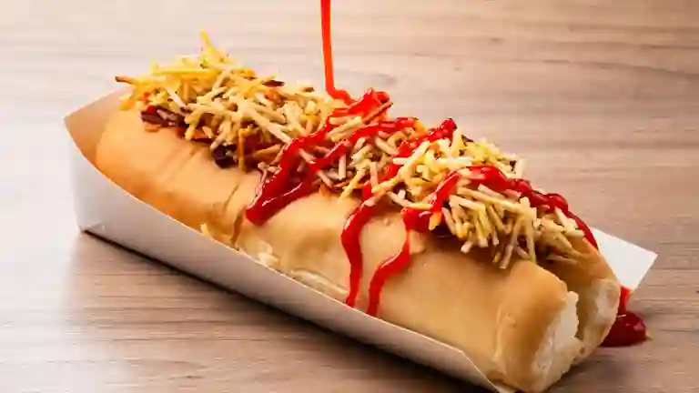 Perro caliente súper six con salchicha americana ensalada arturo , ripio, queso, tocineta y salsas de la casa