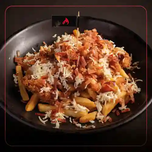 Papitas a la francesa coronadas con jugosas tiras dep echuga perfectamente crujientes, bañadas en salsa tartara, y piña caramelizada de la casa, con trozos de bacon ahumado crujiente y queso costeño rayado.