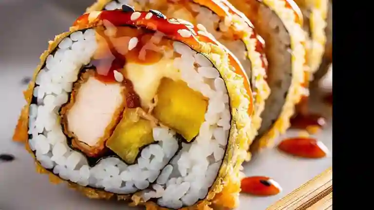 Delicioso rollo de 10 bocados, relleno de pollo tempura, queso crema, maduro y bañado en nuestra deliciosa salsa japonesa (foto solo de referencia)