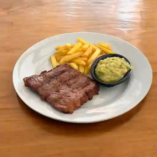 300 Gr de carne de res acompañado con papa a la francesa, ensalada del día, salsa ajo de la casa y guacamole.