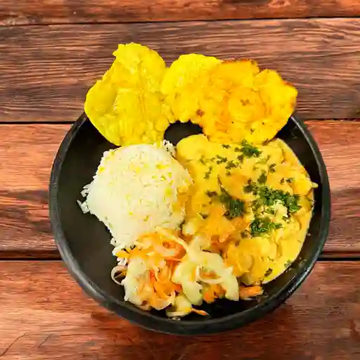 Cazuela de mariscos acompañada de porción de arroz, ensalada del día y patacones.