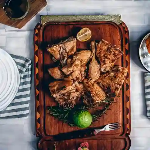 4 Presas de pollo acompañado de papa al vapor, ensalada del día y salsa de la casa.