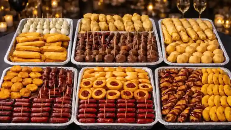 Son 700 pasabocas surtidos: 100 pasteles + 100 churros + 100 chorizos + 100 buñuelos + 100 mini sandwichs + 100 aros de salchicha + 100 huevos de codorniz. incluye salsa rosada