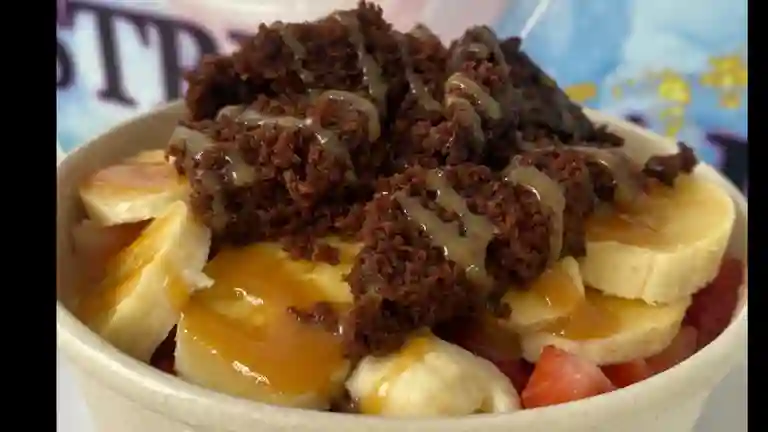 Postre con base, 2 frutas, topping y salsa a elegir 16oz.