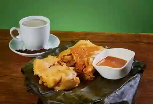 Tamal especial: masa de maíz rellena con cerdo, pollo, huevo, zanahoria y especias, envuelta en hoja de plátano.