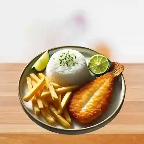 Pescado acompañado de arroz, papas a la francesa y bebida a elegir.