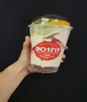 Postre a base de proteína, con trocitos de fruta natural y toppings de mezcla de frutos secos.