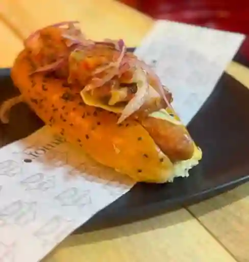 Chorizo con chimichurri, queso doble crema, chicharron, acevichado, pan artesanal y papa a la francesa.