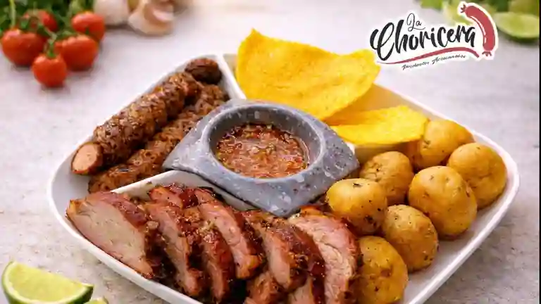 Picada mixta con chorizos artesanales, bondiola de cerdo ahumada y costilla ahumada bbq, acompañada de papas criollas y salsas.
