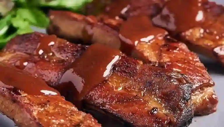 Costilla de cerdo bañadas en salsa bbq, papas fritas pequeñas, ensalada de la casa.
