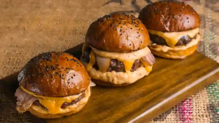 Pan brioche tierno y ligeramente tostado, 200 g de carne de res ahumada lentamente, bien cocinada, jugosa, con color rojizo característico del ahumado artesanal, doble bacon de la casa, doble queso cheddar fundido y nuestra salsa de la casa para un equilibrio perfecto de sabor.
