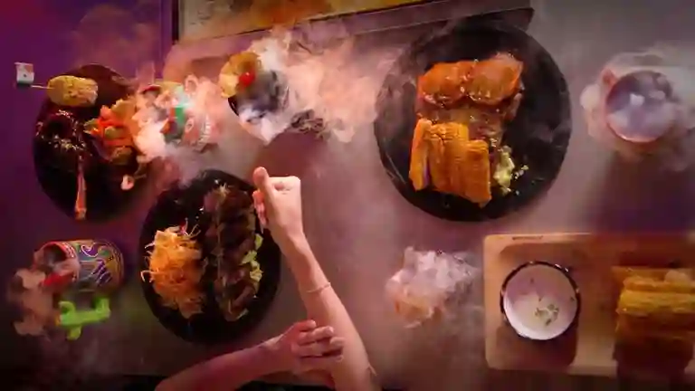 Plato para compartir, 12 tortillas de maiz, totopos, con carnitas, cochinita pibil, pollo guajillo, guacamole, pico de gallo, lechuga batavia y sour cream, acompañado de bebidas.