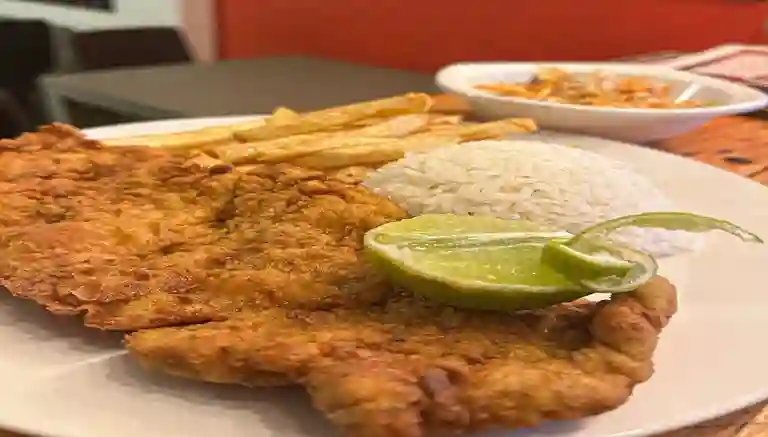 Chuleta de pollo empanizado, acompañado de arroz, papas a la francesa, ensalada y jugo del día 10 oz.