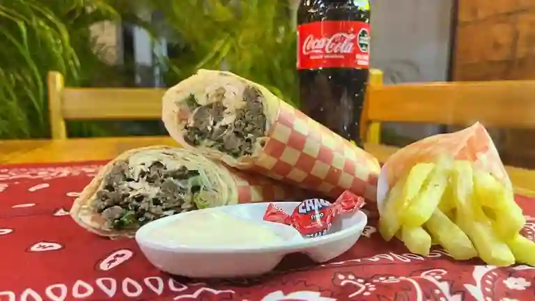 Trozos de pollo bañados en salsa tahine, carne de res a la kafta, pepino encurtido, lechuga, tabule, especias árabes, salsa de ajo, cubierto en pan árabe.
