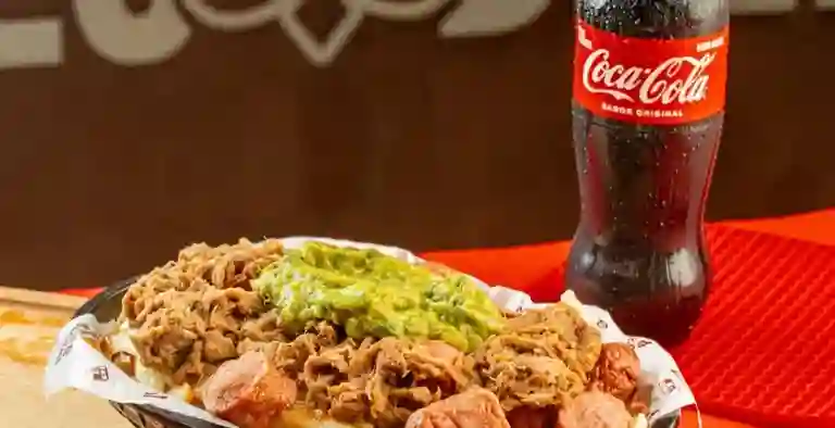 Papas a tu elección, salchicha, queso gratinado, pulled pork carne de cerdo desmechada bañada en salsa bbq y guacamole