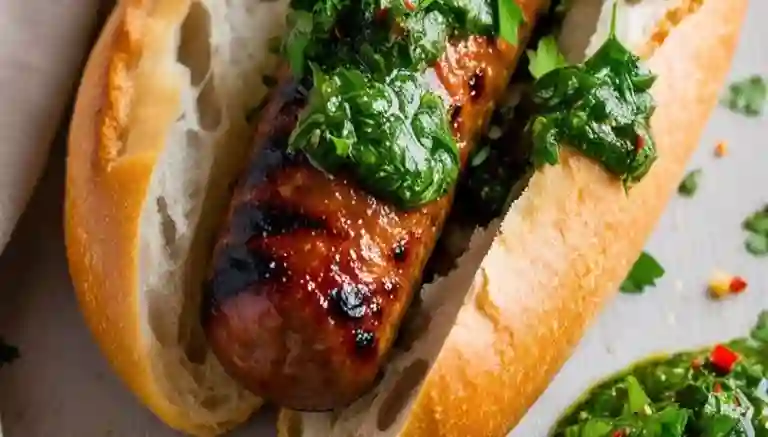 Chorizo premium aretesanal de 120grs de carne magra de cerdo y tocino, pan baguette de masa madre, chimichurri de la casa, acompañado de ensalada y salsa criolla