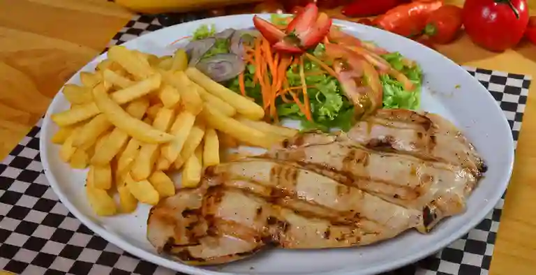 Chuleta de cerdo acompañado de arroz especial de la casa, papas a la francesa y ensalada del día.
