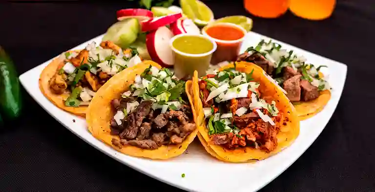 3 Tacos de res, especias mexicanas, guacamole, pico de gallo, consomé y nachos.