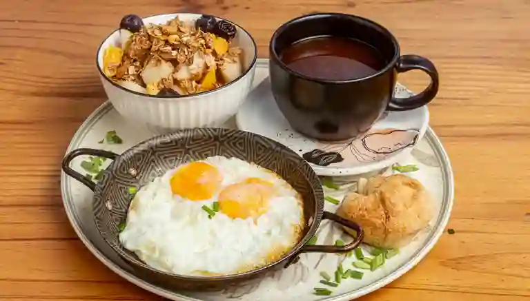 Huevos en preparación, complemento elegir con tocineta, pan, porción de fruta y bebida a elegir. 12 oz