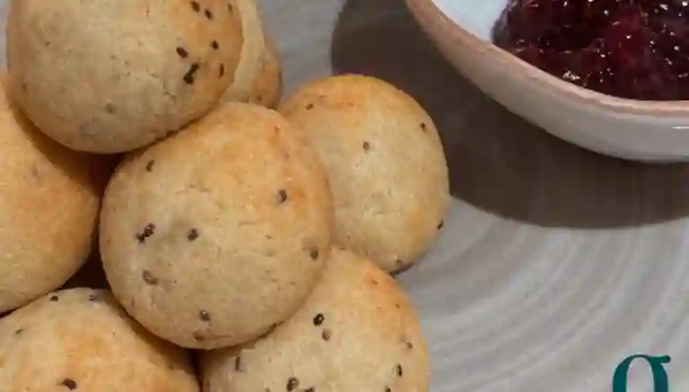 Una opcion mas saludable de mini pandebonos, con harina de almendras, mantequilla ghee, semillas de chia y sin azucar añadido. acompañados de mermelada de frutos rojos y queso crema