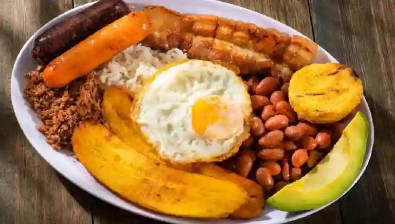 Incluye: poción de arroz, carne molida, arepa, aguacate, cazuela de frijoles, tajadas de plátano, chorizo santarosano, chicharrón, huevo frito.