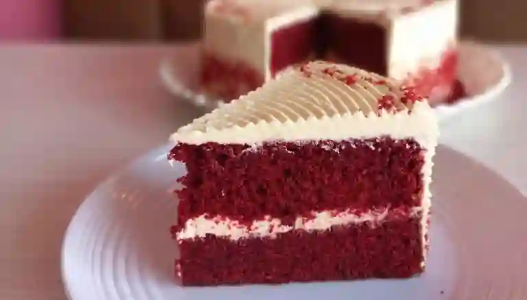 Porción Bizcocho rojo aterciopelado, suave y húmedo, con un ligero toque de cacao, relleno y cubierto con crema de queso, que ofrece un equilibrio perfecto entre dulzura y cremosidad.
