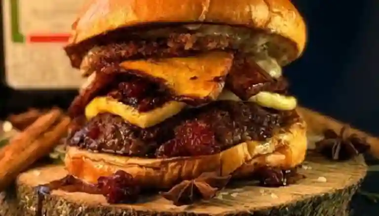 Hamburguesa en Pan brioche, carne angus 160 gramos, doble tocineta, doble queso mozarella, doble queso cheddar, pepinillos, salsa big, ketchup, lechuga.