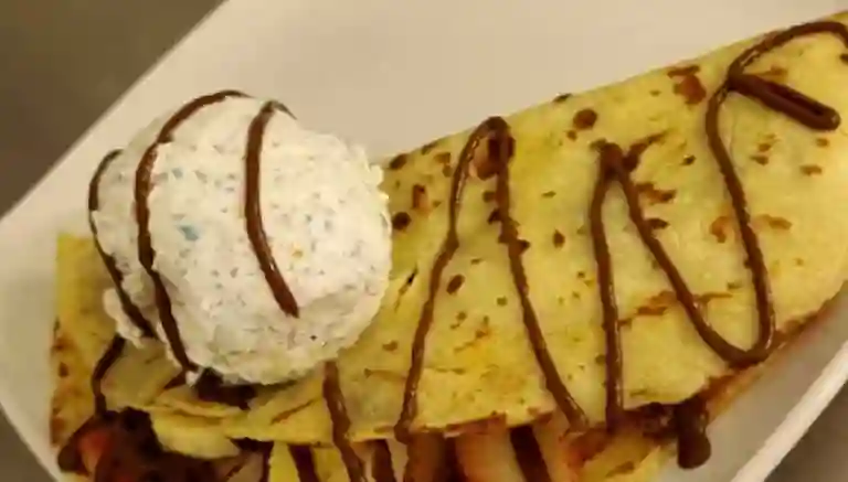 Crepe dulce relleno con helado, fresa, banano y Nutella. Incluye salsas y crema chantilly, con opción de elegir salsa.