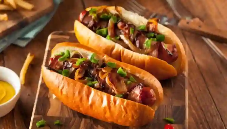 Pan de masa madre, Salchicha artesanal a elegir, Crujiente cebolla caramelizada con tocineta, Queso americano fundido se combinan con una Salsa de la casa y Salsa de maiz dulce + Papas rústicas y crocantes.
