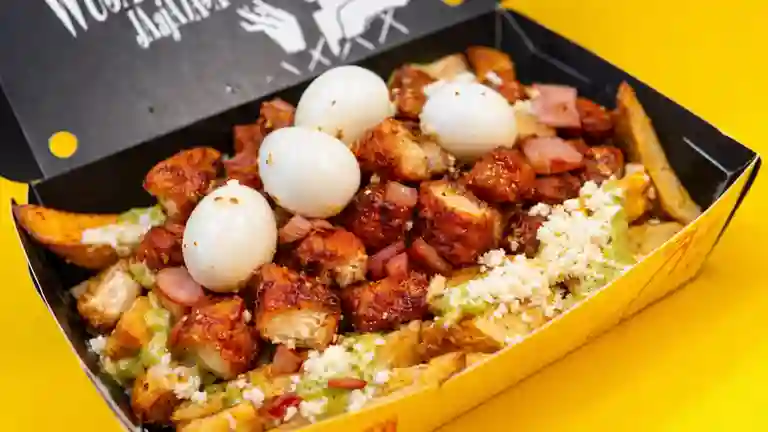 Papas en doble fritura con queso blanco, pollo apanado, tocineta, huevos de codorniz, miel de Jäger y tártara de limón.