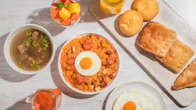 Dos porciones de huevos pericos (con tomate y cebolla) y dos bebidas a elección.